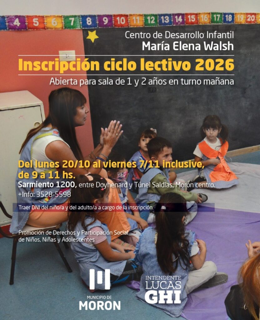 El Centro Construyendo Sueños, ubicado en Avellaneda 2896 esquina San Francisco (Morón sur), ofrece salas para niños de 1 y 2 años en turnos mañana y tarde. Las inscripciones se realizan de 9 a 11 hs y de 14 a 16 hs. Por su parte, el Centro María Elena Walsh, en Sarmiento 1200 entre Doyhenard y Túnel Saldías (Morón centro), atiende a niños de 1 y 2 años solo en turno mañana, con horarios de inscripción de 9 a 11 hs.