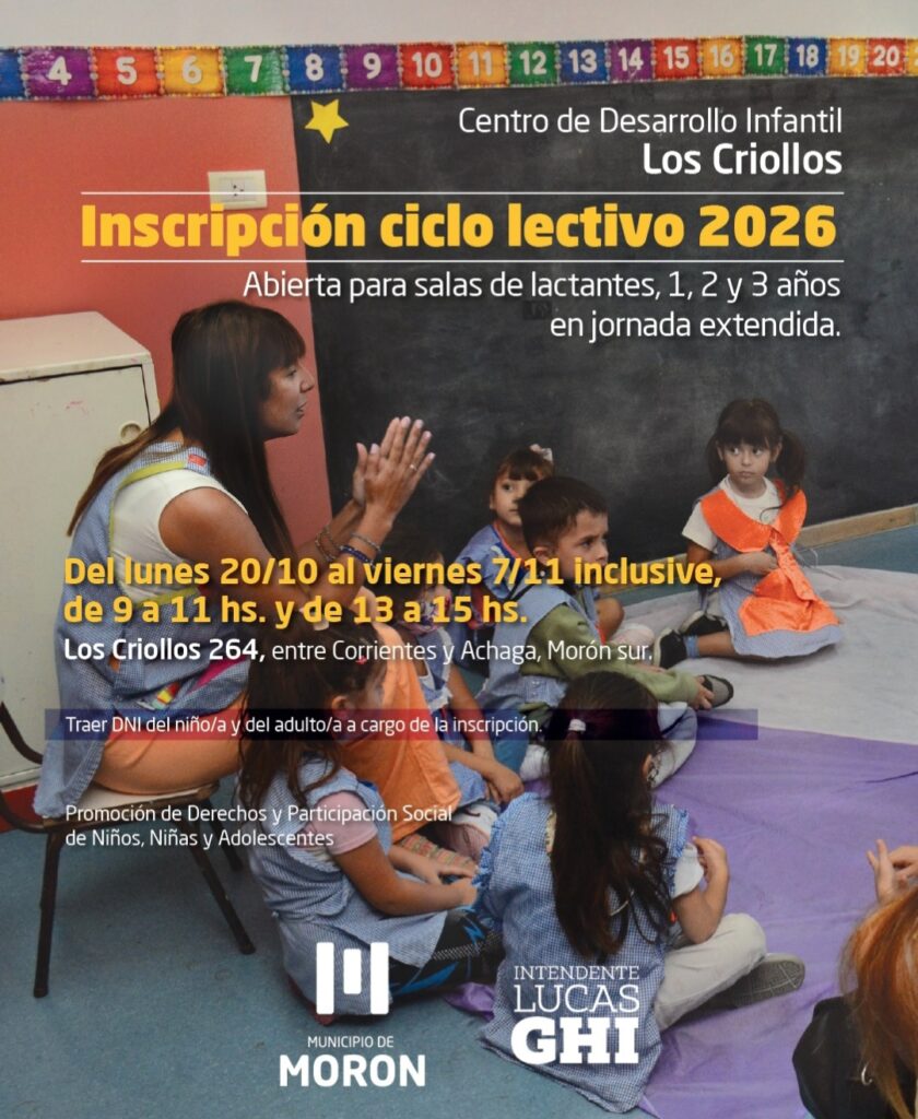 El tercer espacio, Centro Los Criollos en Los Criollos 264 entre Corrientes y Achaga (Morón sur), es ideal para familias que buscan jornada extendida, con salas para lactantes (desde 45 días), y niños de 1, 2 y 3 años. Las inscripciones están abiertas de 9 a 11 hs y de 13 a 15 hs. Todos los centros priorizan el desarrollo integral en un ambiente seguro y afectivo.