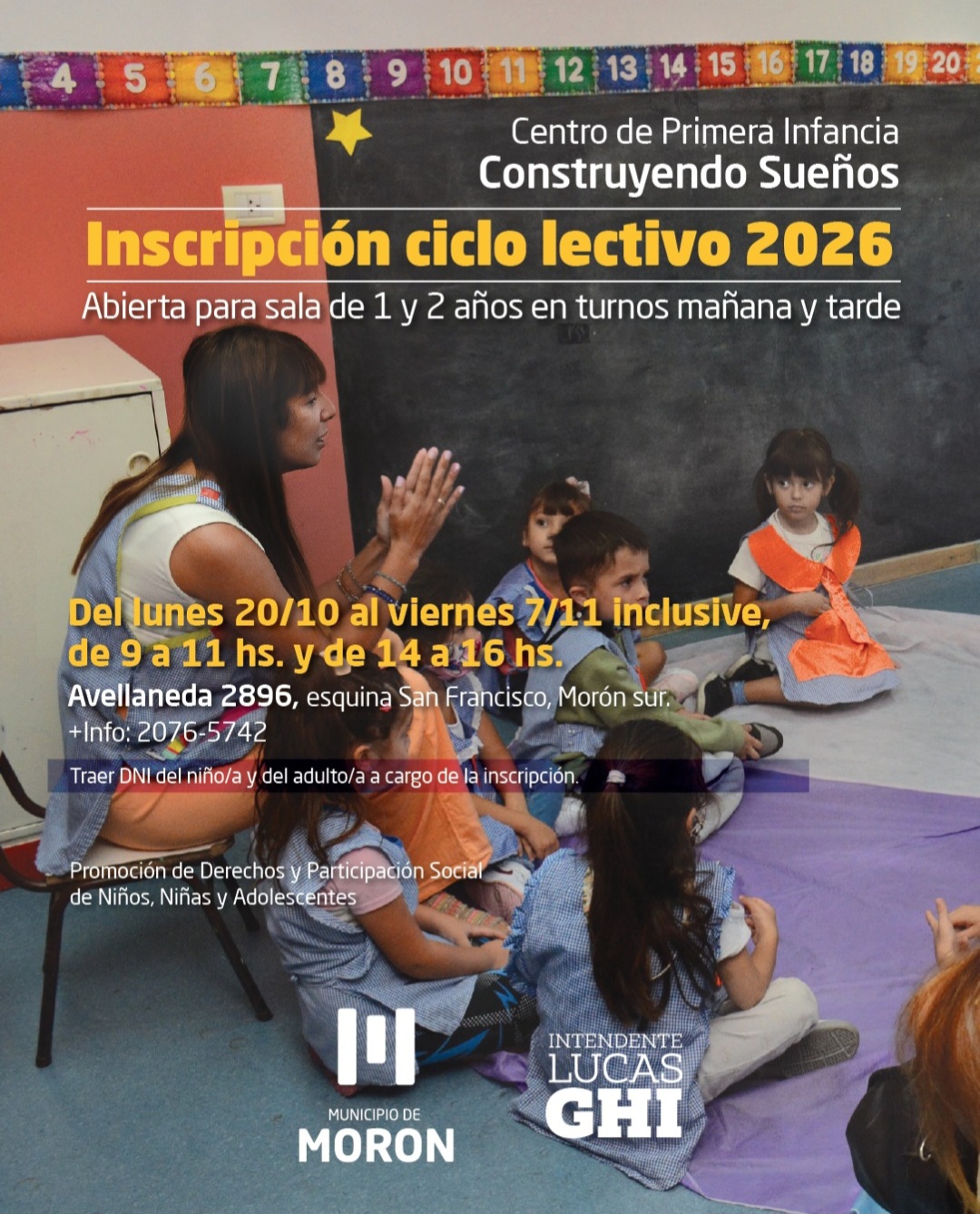 El Centro Construyendo Sueños, ubicado en Avellaneda 2896 esquina San Francisco (Morón sur), ofrece salas para niños de 1 y 2 años en turnos mañana y tarde. Las inscripciones se realizan de 9 a 11 hs y de 14 a 16 hs. Por su parte, el Centro María Elena Walsh, en Sarmiento 1200 entre Doyhenard y Túnel Saldías (Morón centro), atiende a niños de 1 y 2 años solo en turno mañana, con horarios de inscripción de 9 a 11 hs.