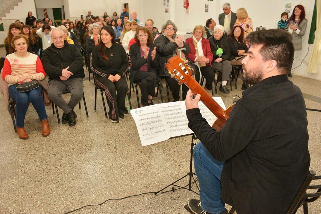 El cierre de la celebración tuvo un toque artístico inolvidable: el guitarrista Fernando Villa interpretó “La Suite Argentina” de Eduardo Falú, recibiendo una ovación de pie. Luego, todos los presentes se unieron para cantar el feliz cumpleaños a la biblioteca, coronando una jornada llena de afecto y comunidad.