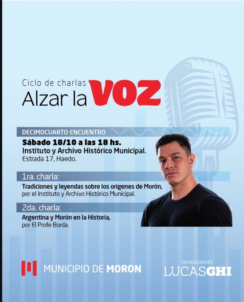 Este sábado 18 de octubre a las 18 hs, en su décimo cuarto encuentro, llega el historiador Pablo Borda a dialogar en el Archivo Histórico de Morón en el especial “Ser Moronense” de Alzar la Voz, con su charla “Argentina y Morón en la historia”.