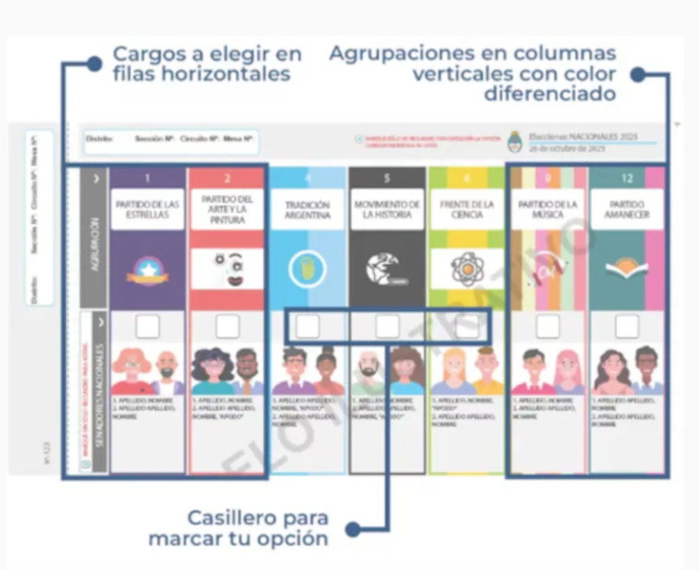 La boleta tiene un diseño en forma de tabla: las filas horizontales representan las categorías a votar (diputados nacionales y, en distritos como CABA o Salta, también senadores), mientras que las columnas verticales muestran las listas de candidatos de cada partido o alianza. Cada casillero es un recuadro donde se marca la preferencia. En el dorso, hay espacio para la firma de la autoridad de mesa, y el talón troquelado queda en el talonario para control. Es un papel grande y visible, con solo imágenes o leyendas autorizadas por la Justicia Electoral, asegurando el secreto del voto.